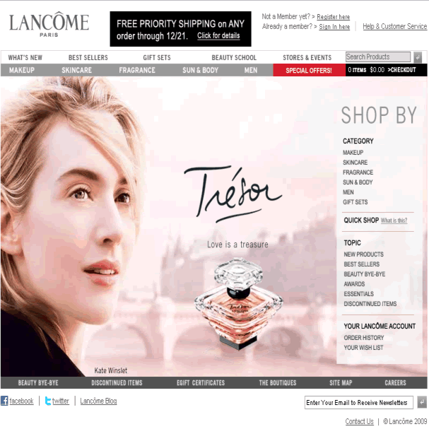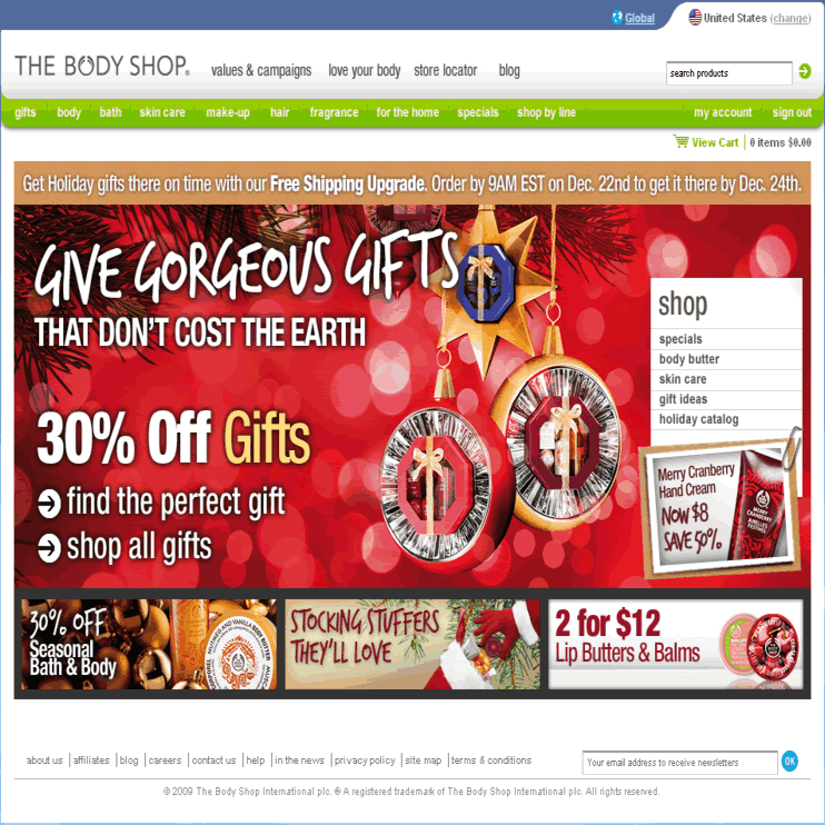 - (12/19/2009更新): 只要在12/21/2009, 11:59pm(美國東岸時間)前在美國官網訂購商品, 不論購買金額, 即可享免費美國國內優先郵件運送服務。同時, 購滿USD$40, 可免費獲贈6件式高級樣品禮, 包括四色眼影, 護唇膏, 唇膏, 眼霜, 抗皺霜,和兩色腮紅。