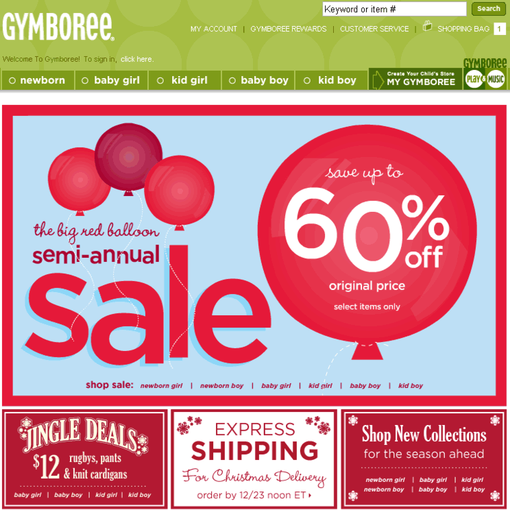 - 非常受歡迎的美國品牌童裝Gymboree, 也在今天(12/22/2009)展開4折起的半年清倉活動, 不過, 只有精選商品才有這麼漂亮的價格, 伊洛娜大概瀏覽了一下特賣內容, 其實款式也不少, 有76款2歲以下女嬰服飾, 86款2歲以下男嬰服飾 , 161款3個月至5歲女童服飾, 86款3個月至5歲男童服飾, 199款3至12歲女孩服飾, 和135款3至12歲男孩服飾。但是呢....以這個品牌的受歡迎程度, 伊洛娜相信, 很多款式很快就買不到了。