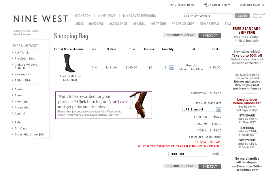 - 台灣女性來美國一定會血拚的美國女性服飾品牌Nine West, 今天(12/22/2009)也為他們的最低5折起的清倉大拍賣加了一些新款式, 光女裝就有近100種款式, 包括上衣, 裙子及外套等。而上班女郎幾乎人人一包的Nine West包包區, 也有60款包包等您來挑, 當然, 最受大家歡迎的鞋類商品, 包括便鞋, 高低跟鞋及靴子, 則有數百雙款式等您帶回家。