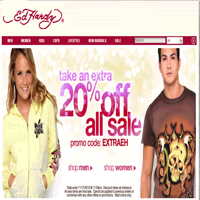 - Tatto文化的流行品牌: Ed Hardy, 也加入美國購物季的折扣行列中。即日起至11/17/2010, 在Ed Hardy 美國官網購買折扣品(目前已是5至7折價), 還可再享8折優惠, 折扣碼: EXTRAEH! 不過, 這些商品是最後拍賣品, 也就是說廠商不提供退換貨服務。