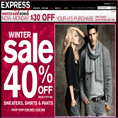 - 目前Express美國官網最新的促銷活動是"冬季6折促銷"的活動!同時, 只要您在即日起至12/20/2010(美國東岸時間)在他們美國官網購滿USD$75, 即可折抵USD$30!活動折扣碼為9830或9824。