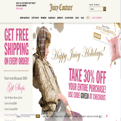 - Juicy Couture今年耶誕前的促銷活動進入高峰期! 即日起至12/16/2010, 在美國官網購物, 不論折扣品或全價品都可享7折, 折扣碼: GIVE30 。同時, 在官網消費不限金額都可免美國國內運費!