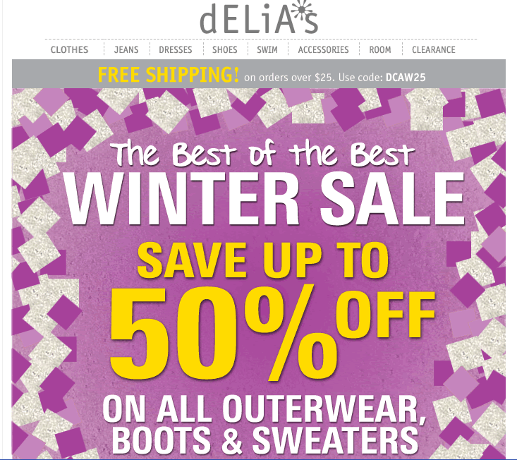 - 在美國很受喜愛的青少女服飾品牌之一: dELiAs, 目前美國官網的冬季特賣包括外套, 上衣, 毛衣及靴子, 全都是5折起; 另外, 他們也同時針對褲類商品,像牛仔褲及長褲 , 推出買一件第二件5折的促銷活動!