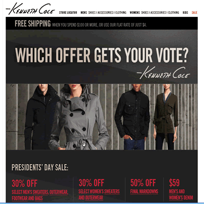 - 即日起至02/21/2011, Kenneth Cole美國官網推出President Day Weekend Sale, 內容包括: 精選男用商品7折起(毛衣, 外套, 鞋子, 包包); 精選女性服飾7折起(毛衣, 外套); 最後清倉品5折起, 男女牛仔褲USD$59起!