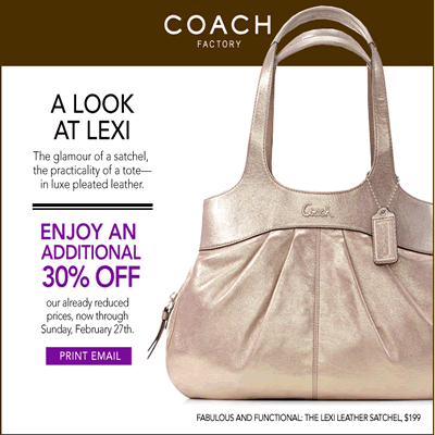 - 如果您錯過2011年西洋情人節的Coach Factory 7折促銷, 那千萬不要錯過進行中的02/16/2011至02/27/2011的店面特價再7折的活動! 其中一款新式Coach包就在左圖。