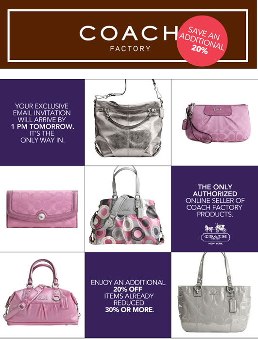 - Coach factory online store已經上線了, 再44小時拍賣就要結束了! 這次促銷活動是全網商品7折特價後再8折優惠, 有些商品等於是以原價的3折就可買到! 美國購物通這次難得收到下單許可, 需要代購官網上的Coach包的朋友, 歡迎使用本站代購服務委託單自動傳送系統下單!
