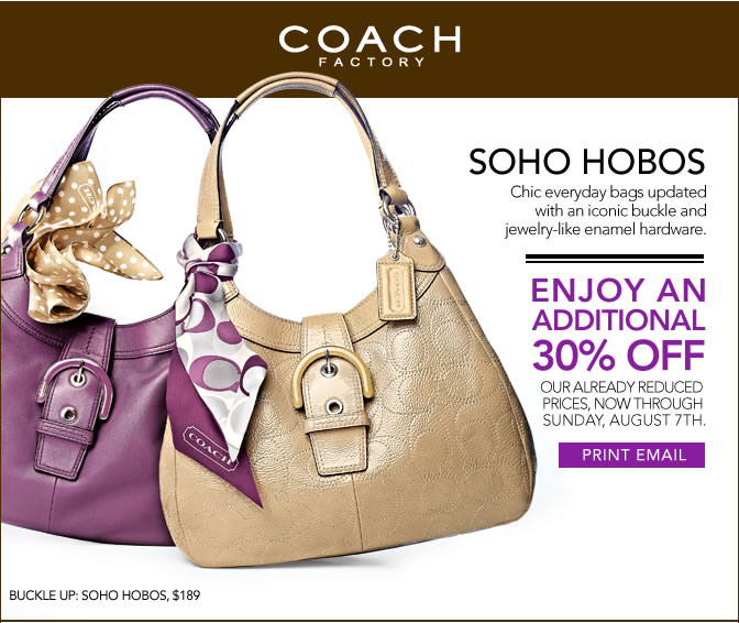 - Coach Factory Store 實體門市又有特價後再7折的優惠!上次錯過官網特價後再8折的朋友, 如果您心中已有中意的包包, 請把握這次的Coach Outlet門市代購活動! 活動的優惠期只到08/07/2011, 想要擁有高貴不貴的Coach名牌包, 請把握有限時間將您理想的Outlet款式的Coach包相關資訊, 包括包包圖片, 編號, 英文品名, 顏色(英文), 數量及相關資訊網頁連結等, 使用本站最新提供的代購服務估價委託單自動傳送系統寄給美國購物通。 同時, 因為這是限量店購服務, 請在下單前參考本站品牌直營門市代購服務說明, 並請您最晚在台灣時間: 11:00pm, 8/4/2011 將訂金匯入本站指定收款帳戶, 才能趕上這一波的Coach7折優惠;