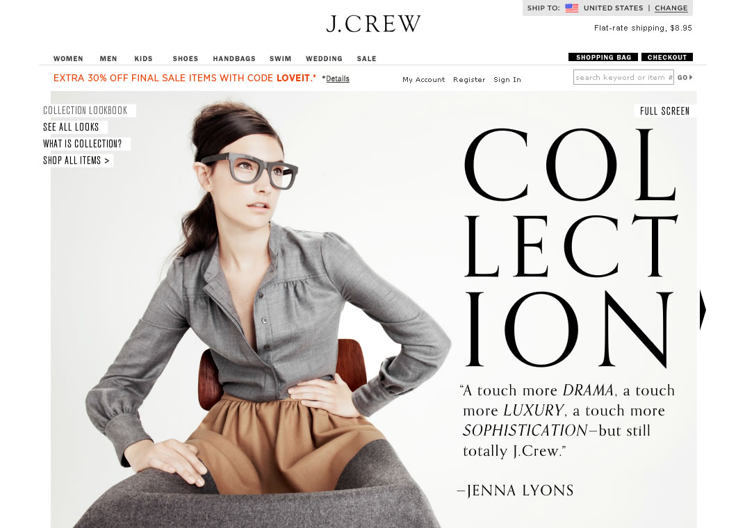 - 即日起至09/09/2011, 在美國雅痞服飾名品: J Crew美國官網購買 Final Sale商品, 只要使用折扣碼, 即可享再7折優惠!同時, 您再也不用擔心J Crew 以購買金額計算美國境內運費了, 即日起, 您最多只需付USD$8.95, 即可把心愛的J Crew的商品買下來, 而且購滿USD$175, 還可免境內運費;