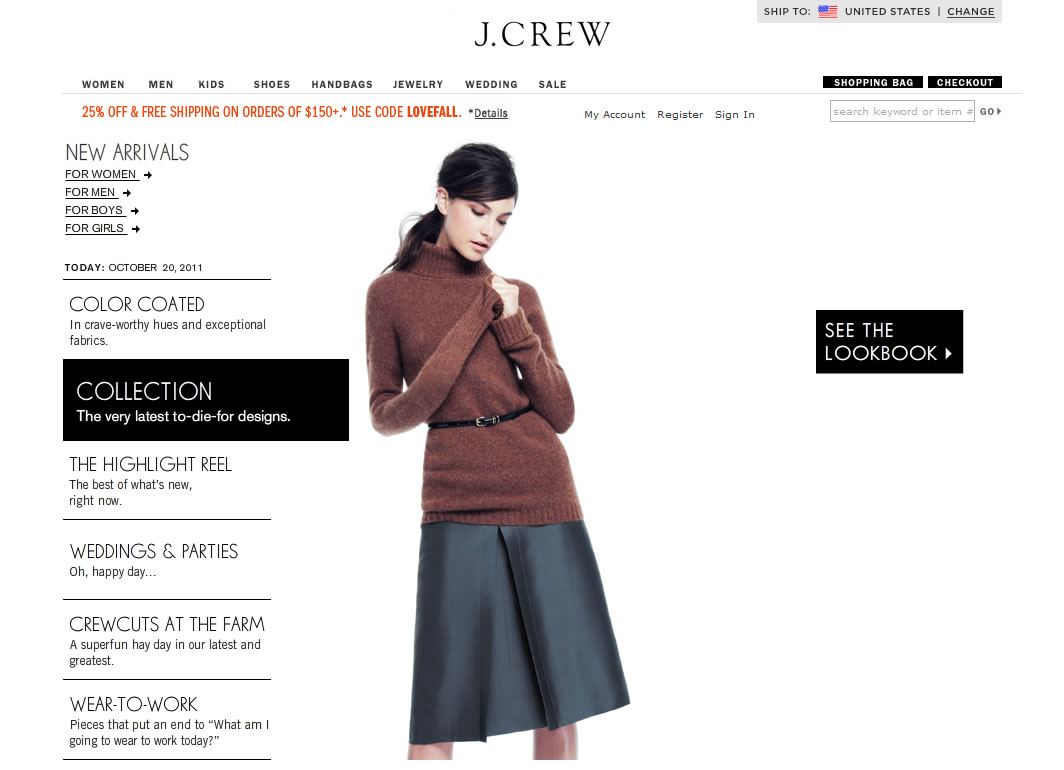 - 美國知名的雅痞風服飾品牌: J. Crew 美國官網, 目前正在舉行使用折扣碼, 購滿USD$150, 不但免境內運費, 還可享7.5折的秋季第一波促銷活動! 這個活動也適用最後清倉品區的商品(這區商品是貨物售出概不退換的, 選購時請務必深思熟慮), 這樣的採購良機只到10/23/2011;