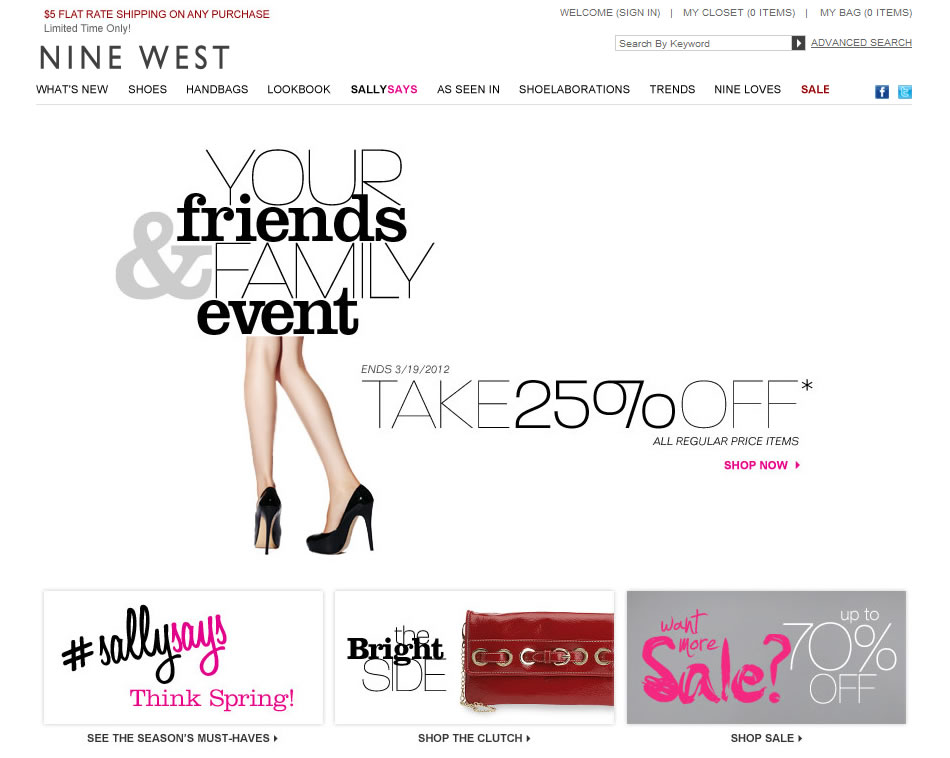 - NineWest美國官網: 即日起至03/19/2012舉行Family and Friends Event, 凡在官網購買全價品, 不用折扣碼, 都可享7.5折; 官網訂購不限購買金額, 都可享美國境內單一價運費USD$5;