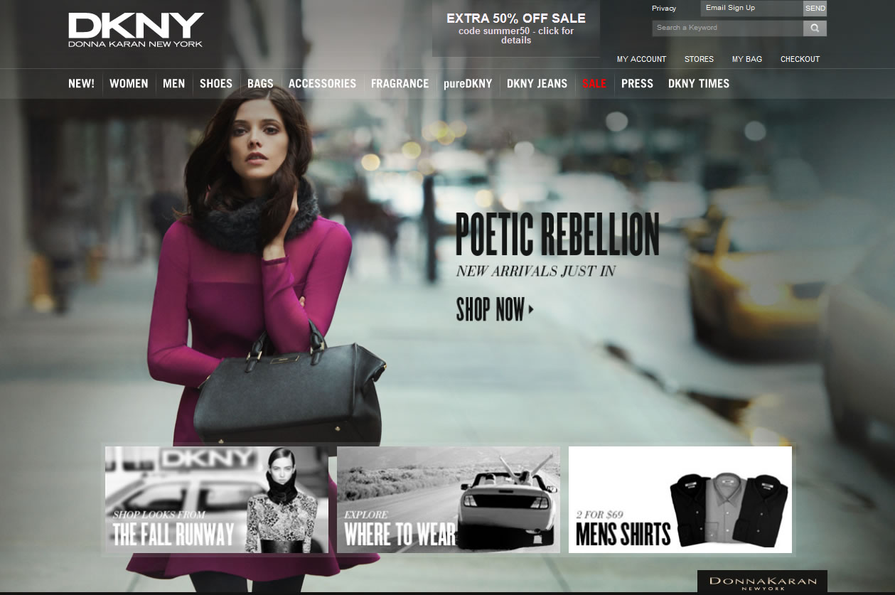 - DKNY美國官網: 即日起至09/03/2012, 官網舉辦使用折扣碼, 精選女裝折扣品及精選男裝折扣品, 一律再享5折優惠 折扣的限時活動 ; 不論購買金額,都可免美國境內運費;